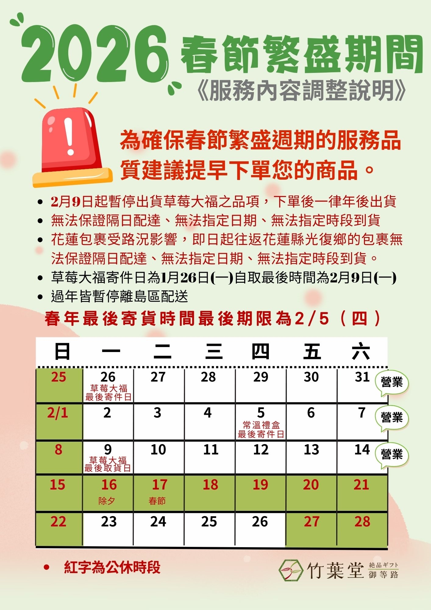 2026一月公休與營業時間公告